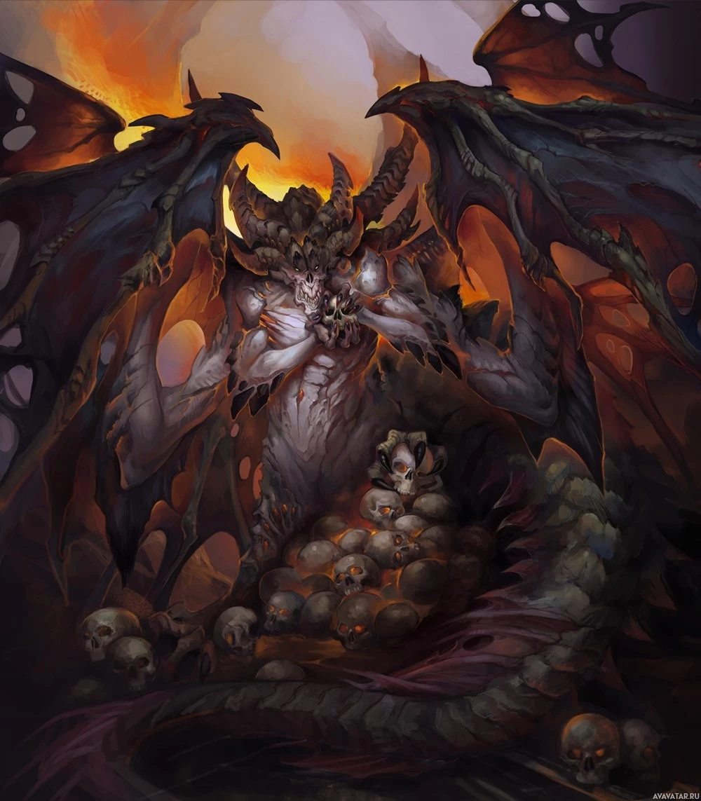 red eyes that give it an intimidating appearance. The creature is standing on a surface that appears to be made of bones, as evidenced by the skulls at its feet. In the background, there's a fiery or molten substance, possibly lava, which suggests a volcanic or hellish environment. The overall atmosphere of the image is dark and menacing, fitting for
