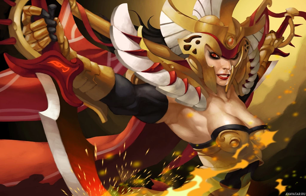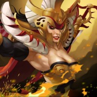 red accents and a helmet that has wings extending from either side of her head. Her attire suggests she may be a character from the "Dota 2" universe, specifically known as "