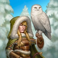 medieval armor and has a hood up. In her hand, she holds