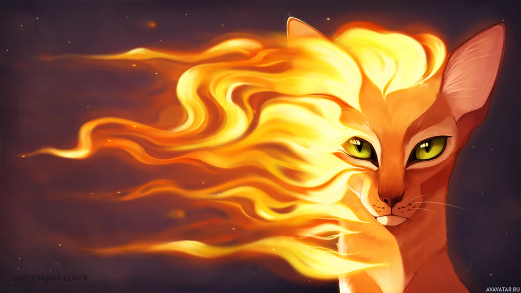 На картинке изображен иллюстрированный персонаж, который выглядит как кошка с пламенем, исходящим изо рта и хвоста, что указывает на магический или фантастический элемент. Фон темный, что контрастирует с яркими деталями пламени. Этот тип произведений искусства может быть связан с такими темами, как фантазия, магия или антропоморфные животные.