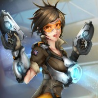 The image shows a character from the video game "Overwatch." This is Tracer, who is known for her ability to manipulate time. She's depicted in an action pose with her signature dual-wielded weapons, which are part of her character design.