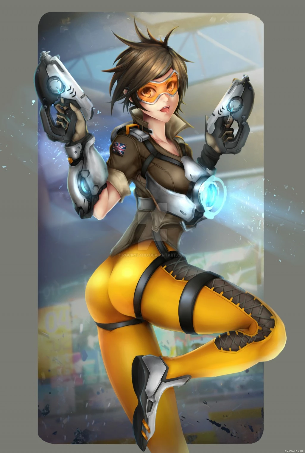 На картинке изображен персонаж из видеоигры «Overwatch». Это Трейсер, которая известна своей способностью манипулировать временем. Она изображена в боевой позе с ее фирменным оружием с двумя стволами, которые являются частью ее дизайна персонажа.