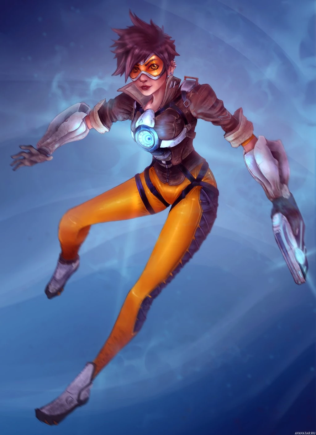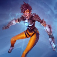 the video game Overwatch. She is known as Tracer, and she is recognizable by her orange-yellow suit with white accents,