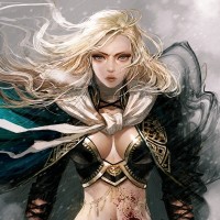 The image shows a character who appears to be a female warrior or fantasy character. She has blonde hair and is wearing armor with intricate designs, suggesting she might be from a fantasy setting or