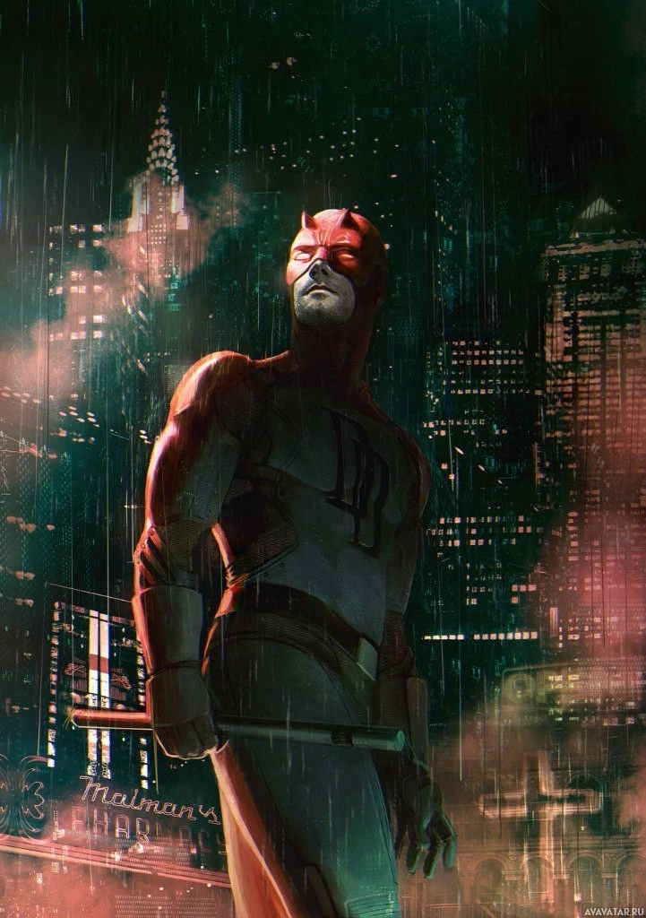 The image shows a depiction of the character Daredevil, who is known for being a blind superhero with