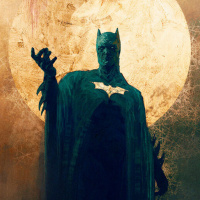 dark sky. The character appears to be dressed as Batman, complete with