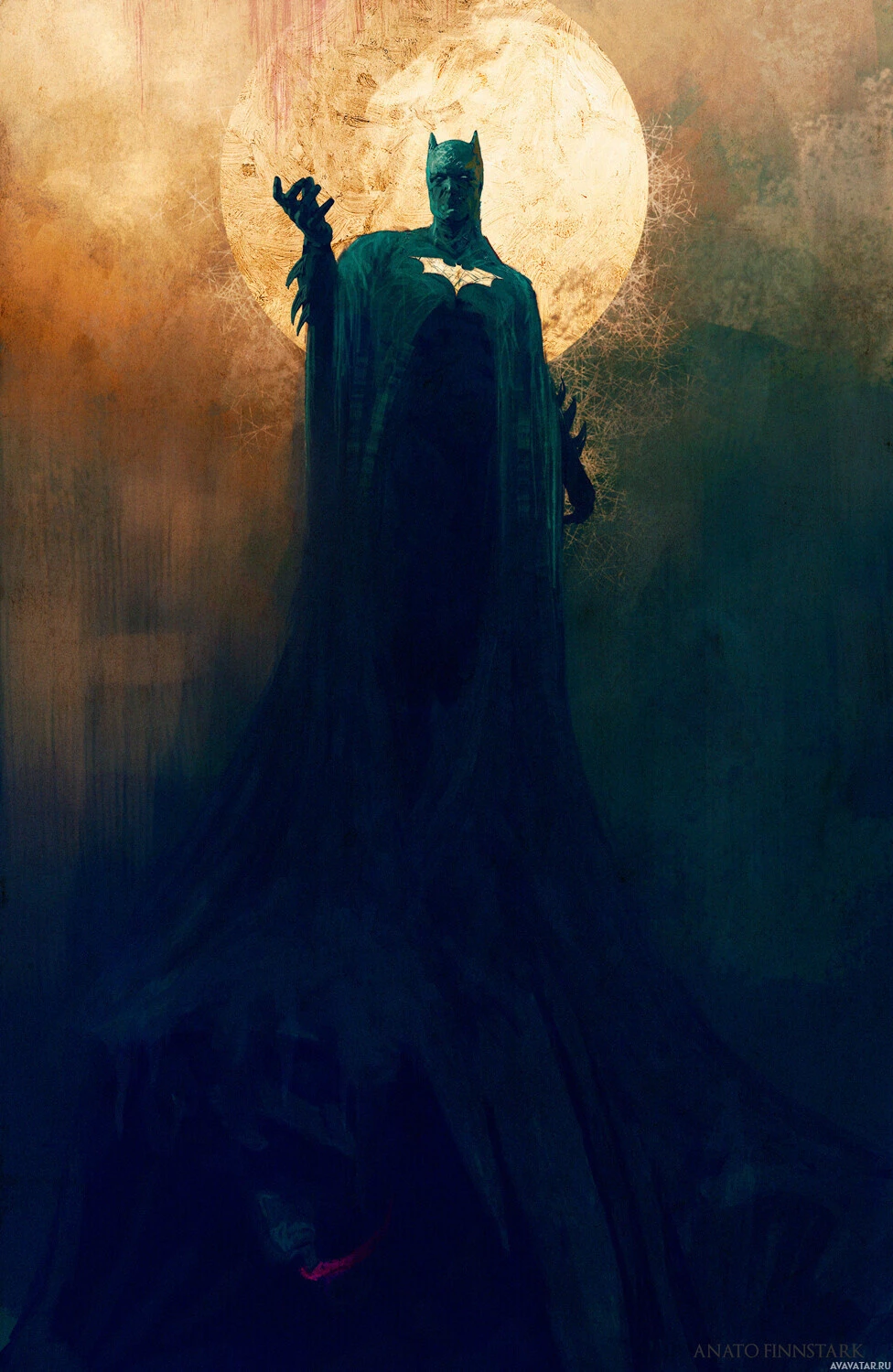full moon, adding to the dramatic and mysterious atmosphere of the scene. The art style is quite evocative, with strong use of contrasts between light and dark, which is typical for Batman-themed illustrations meant to capture the character's nocturnal activities and