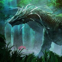 a fantasy scene featuring a large, mythical dragon-like creature. It is situated in a forest or jungle setting with misty and overgrown surroundings. The creature has