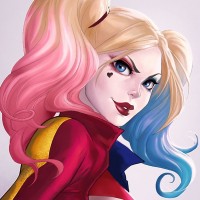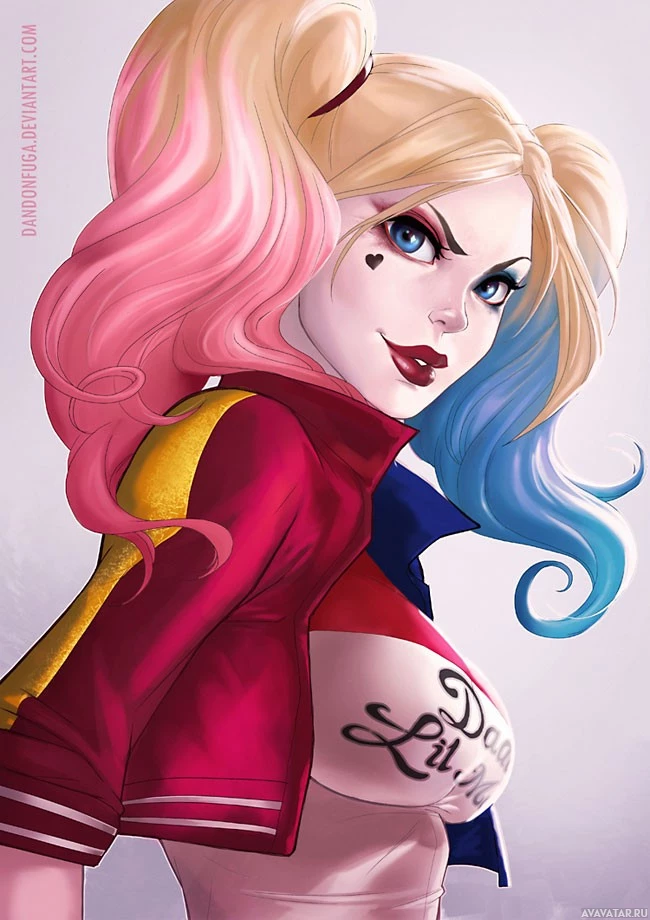 gold accents, and she has the classic Harley Quinn emblem on her jacket sleeve. Harley is also wearing