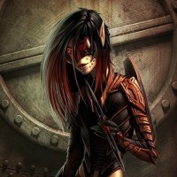 a stern expression and is standing against a background that includes mechanical components such as gears and metal pipes, suggesting an industrial or steampunk setting. The artist's signature can be seen at the bottom right corner of the image.