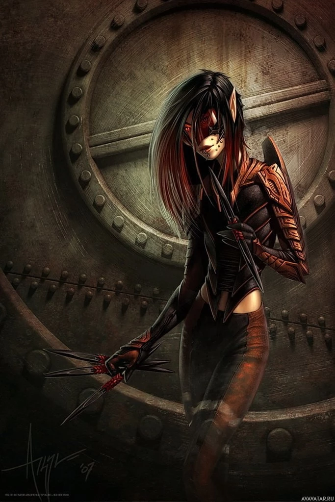 pointed ears, tattoos on her face, and is holding what looks like a pair of throwing knives or weapons in each hand. She has