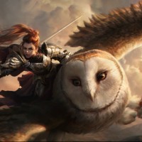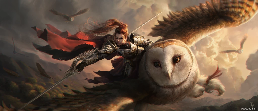 a fantasy scene featuring a character who appears to be riding an owl. The character is a woman with long