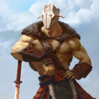 The image shows a character from the game Dota 2. This character is known as Juggernaut, and he is depicted wearing armor that resembles ancient Norse or Celtic attire, with a helmet featuring a face-obscuring mask and what appears to be