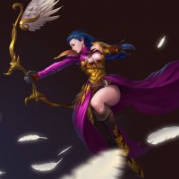 the glowing effect around it. The character also holds an arrow ready for launch. There are feathers flying behind her, adding to