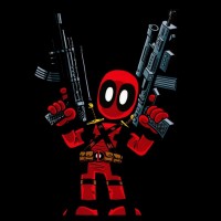 The image features a character known as Deadpool, who is depicted with his signature red and black costume, holding two guns in each hand. He appears to be looking directly at the viewer, giving