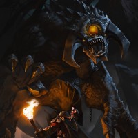 several characters in the picture, but the central focus is on two creatures that resemble dragons or demonic beasts with menacing expressions. One creature is larger and more fierce-looking, while the other appears smaller and less threatening. The setting seems to be a dark cave or underground area, with