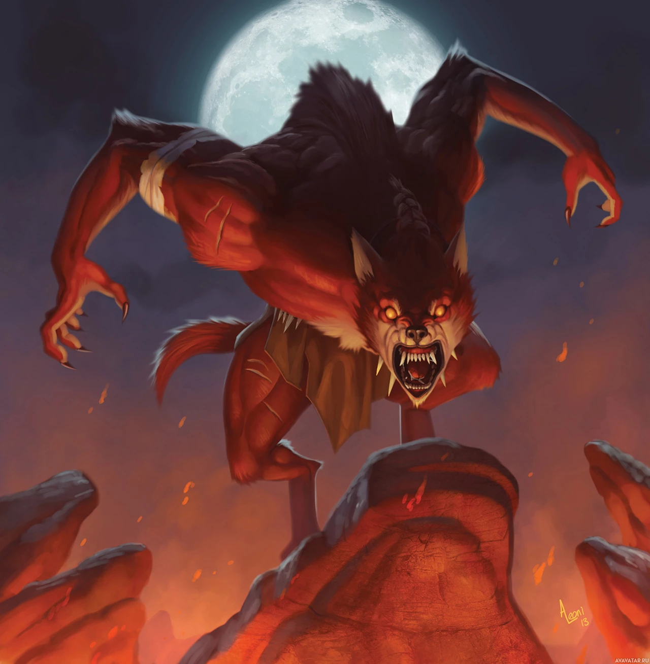 a fantasy scene with a werewolf character. The werewolf is in an aggressive pose, standing on its