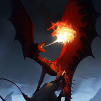 a fantasy scene featuring a dragon. The dragon is shown with its wings spread wide and is engaging in the act of spitting fire, suggesting it might be breathing out flames. The background appears to be an icy or