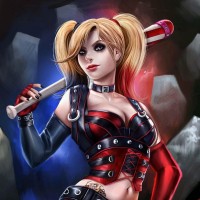 the Gotham City skyline or an underground hideout, consistent with the settings where Harley Quinn is commonly found in comic books and films.