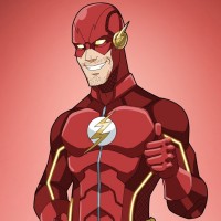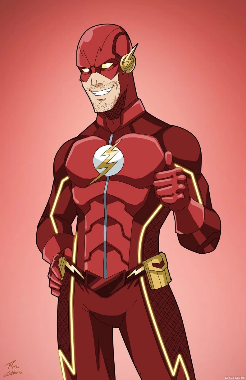 lightning bolts, along with his mask that conceals his identity. The Flash is holding up a thumbs-up gesture, which might be indicative of approval or confidence in facing his
