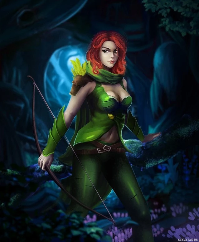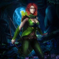 green armor and is holding a bow, which aligns with her role as an archer within the game. She is set against a forest backdrop, suggesting that she may be on a mission or adventure within the game's