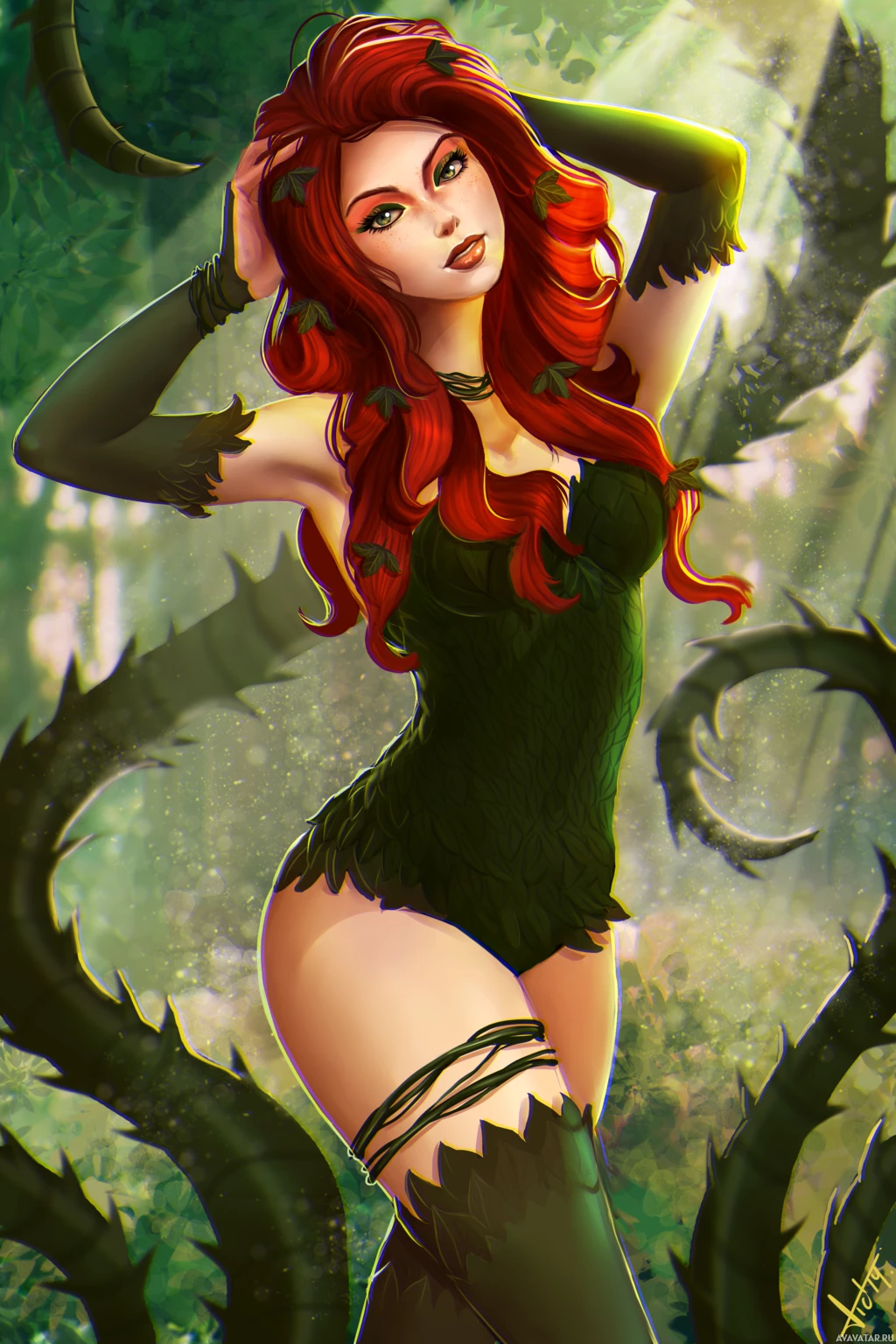 a fictional character from the DC Comics universe. She is portrayed in her iconic green and black costume with vines and leaves as part of her design. Her