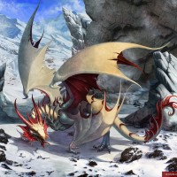 The image depicts a fantasy scene featuring a dragon. It is located in a mountainous, icy environment with a snowy landscape. The dragon has large wings and is holding its tail with one of its claws. It appears to be standing on the ground, which is covered with snow. There is also another creature in the background that resembles a bird or an eagle. This image is likely related to fantasy artwork or illustrations from games or stories where dragons are prominent characters.