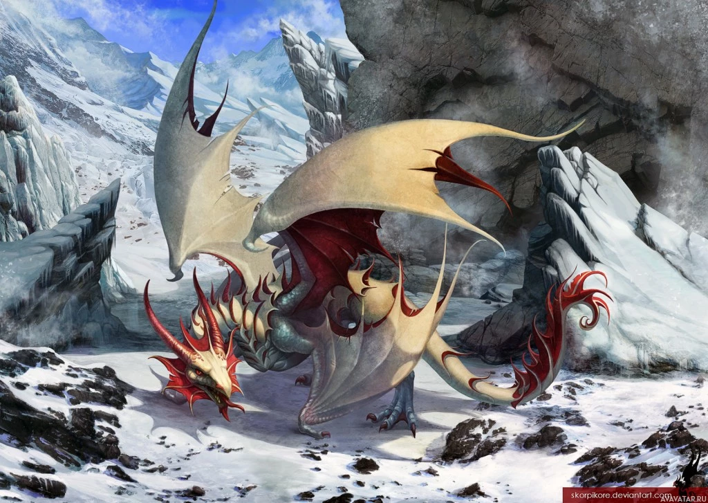 На картинке изображена сцена фэнтези с участием дракона. Он расположен в горной, ледяной среде со снежным ландшафтом. Дракон имеет большие крылья и держит хвост одним из когтей. Он, кажется, стоит на земле, которая покрыта снегом. На заднем плане есть еще одно существо, напоминающее птицу или орла. Это изображение, вероятно, связано с фэнтезийным искусством или иллюстрациями из игр или историй, где драконы являются видными персонажами.