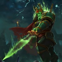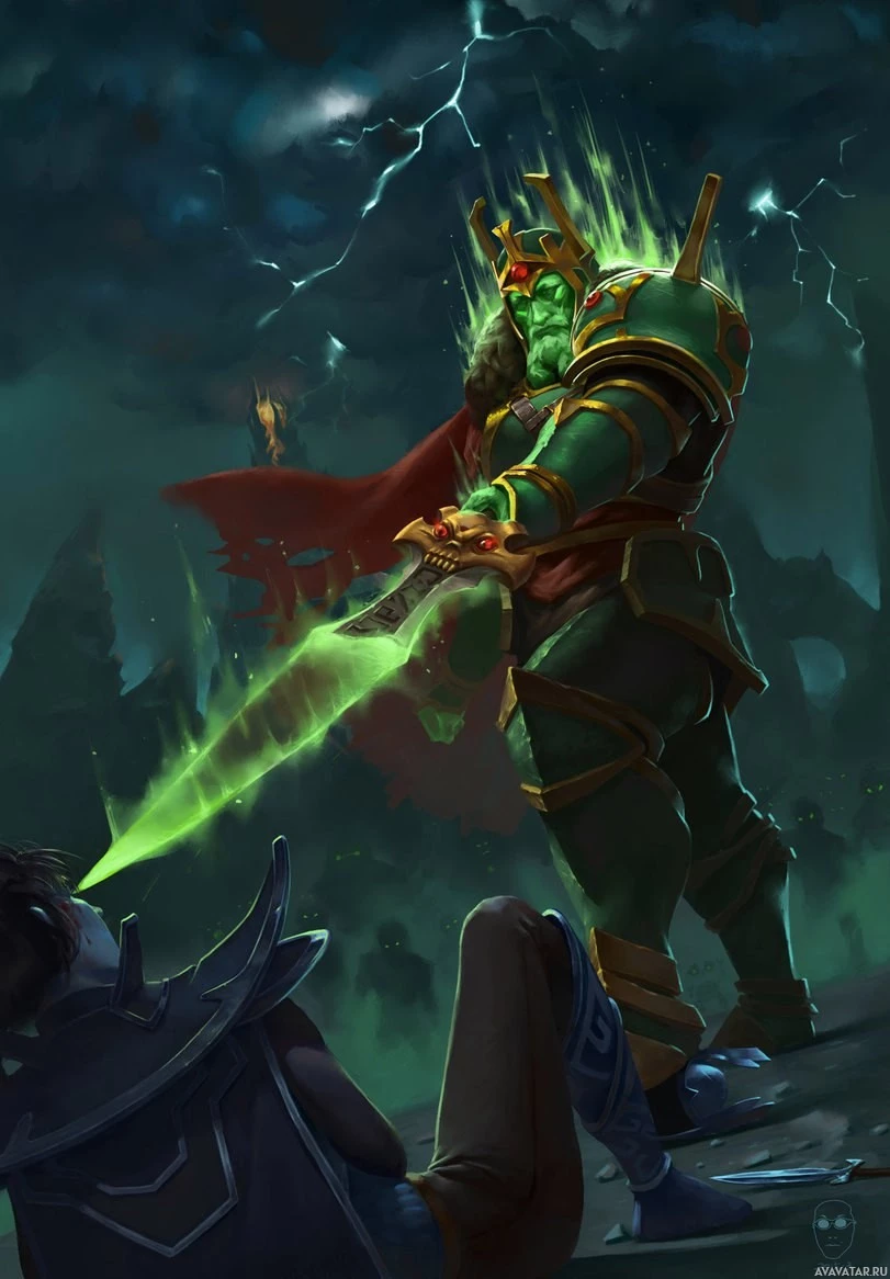 the video game Dota 2. This character is known as Wraith King, and he is depicted in his iconic pose with glowing