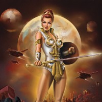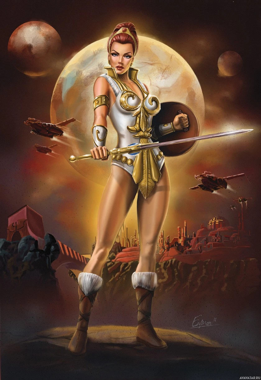 red hair and is depicted holding a sword with her right hand while her left hand holds a shield. She's wearing armor and boots, suggesting she might be part of a fantasy or action-
