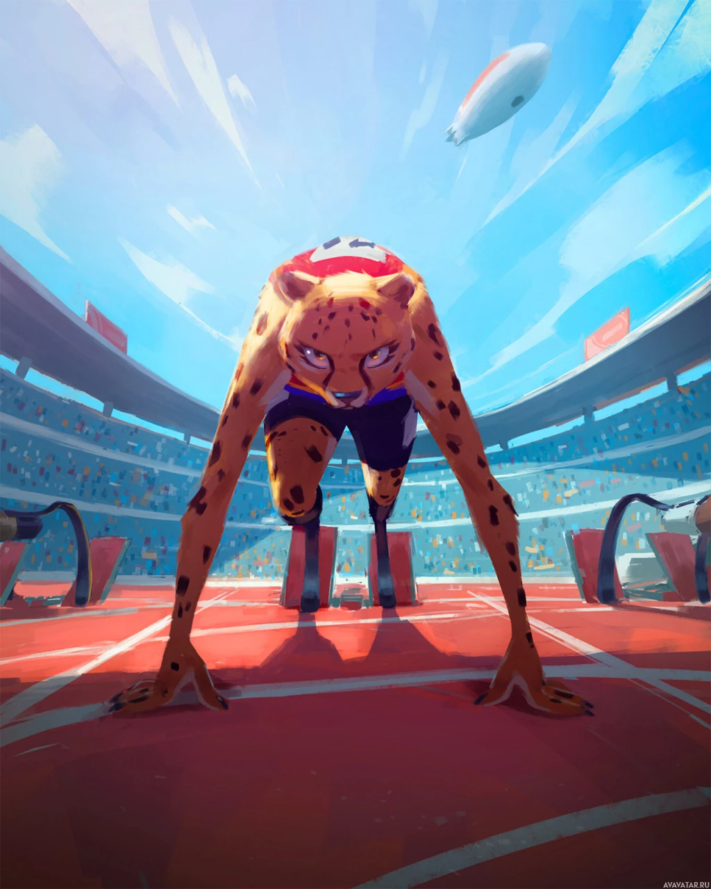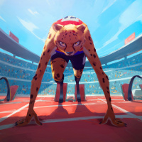 cheetah character participating in a track and field event, specifically the start of a race. It is styled as a digital illustration with