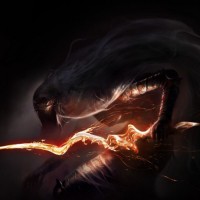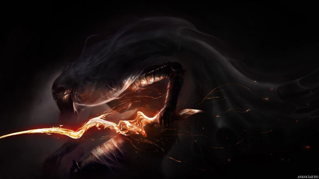 a fantasy scene featuring an armored figure with flames or energy emanating from their hand as they wield a sword. The character is surrounded by a chaotic and fiery environment, suggesting a battle or