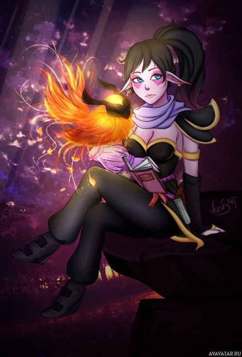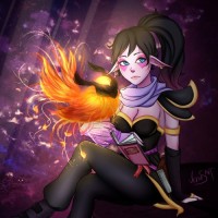 the video game Dota 2. She is depicted with an ethereal appearance, sitting in what looks like a mystical or magical setting with floating embers around her hand and a glowing fire element in her other hand, which suggests she might have some