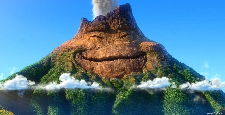 На картинке изображен анимированный персонаж, который выглядит как вулкан с улыбающимся лицом. Вероятно, это из мультфильма «Моана», где персонаж вулкана назван Те Фити.