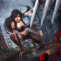 This image features an illustration of a character who appears to be X-23, a mutant with adamantium bones and retractable claws, from the Marvel