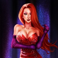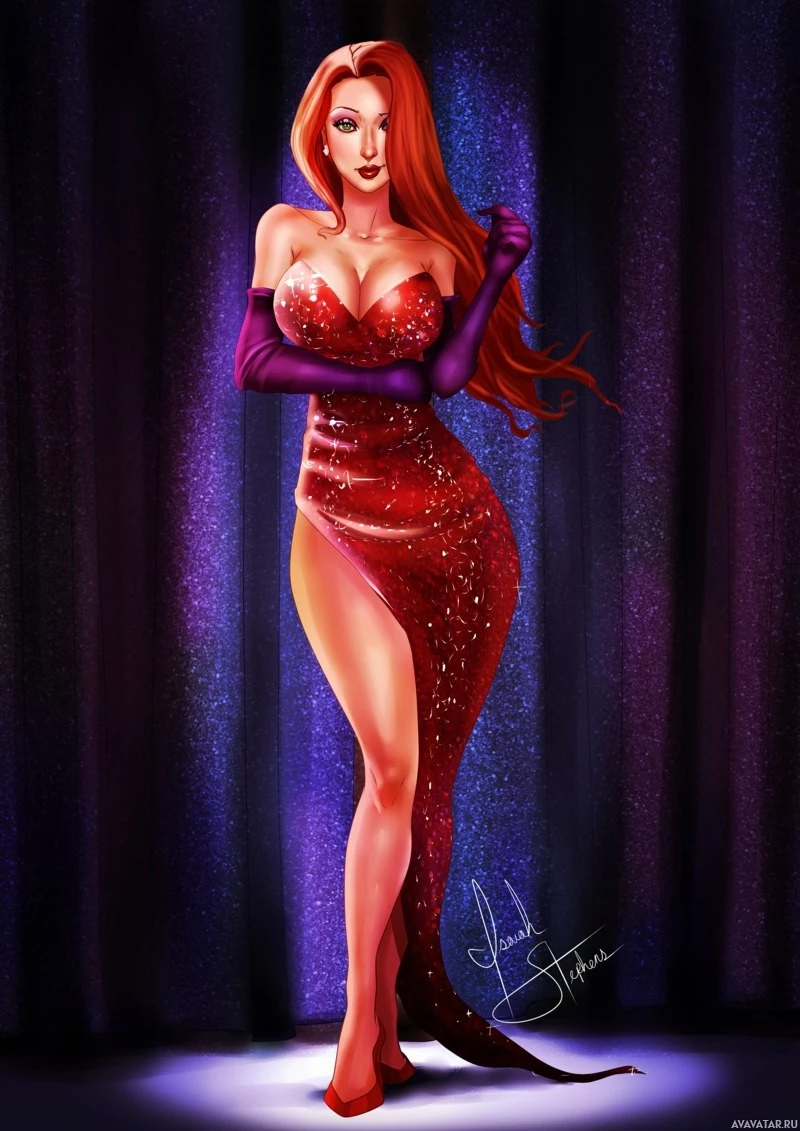 curtain backdrop that suggests she might be on stage or at some form of performance event. There's no mention of "Jessica Rabbit" in the image you provided, so it does not meet the criteria specified.