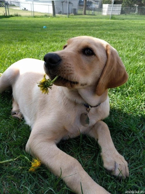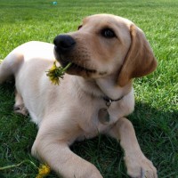 a moment of relaxation. It appears to be eating or holding a dandelion in its mouth. The setting looks like a residential lawn, with a portion of a house visible in the background.