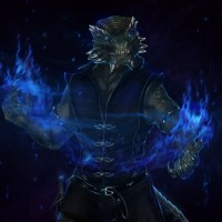 a dramatic pose, possibly casting a magical spell or emanating energy, as suggested by the blue light effects around their hands. The background has a dark, mystical ambiance, fitting