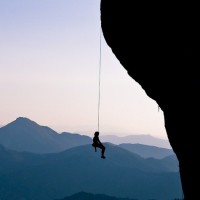 a rocky cliff, hanging from a rope or climbing support known as a camming device, with their hands gripping the rope and feet securely placed on the rock face. Below them is a breathtaking view of mountains under