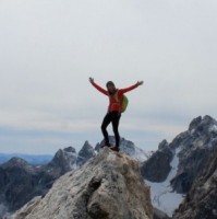 a mountain peak. They are holding their arms out to either side, as if embracing the view or celebrating their achievement. The