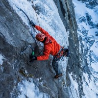 rock climbing on a steep, snowy mountain face. They are equipped with climbing gear such as ropes, harnesses, and helmets for safety, which indicates that they are experienced or well-prepared for this activity. The terrain appears challenging due to