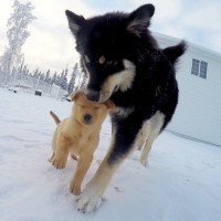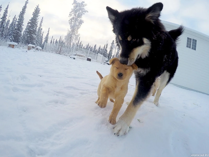 a snowy environment that appears to be a winter setting, likely in the Northern region of North America given the presence of pine trees and the type of building in the background which is typical for such locations. The adult dog has its