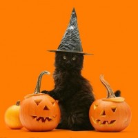 Halloween decorations. The cat is wearing a witch's hat, adding to the Halloween theme. It appears to be a cute and whimsical take on traditional Halloween decorations, as it combines elements of a holiday that typically involve spooky or scary themes with a lighthearted, playful image of an animal dressed in
