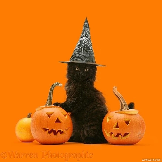 a black cat sitting in front of two pumpkins. The pumpkins have carved faces, resembling jack-o'-lanterns, which are commonly associated with