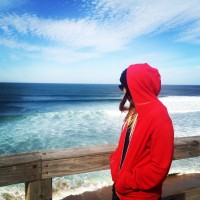 a wooden deck by the ocean. This person is facing away from the camera, looking out at the horizon where the sea meets the sky. They are wearing a red