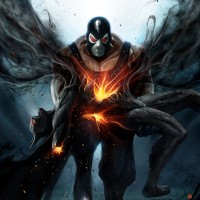 the Batman franchise. This version of Bane is depicted with dark, menacing features and is holding what appears to be a fiery object in his hands. The background has a dramatic, cloud-filled sky with