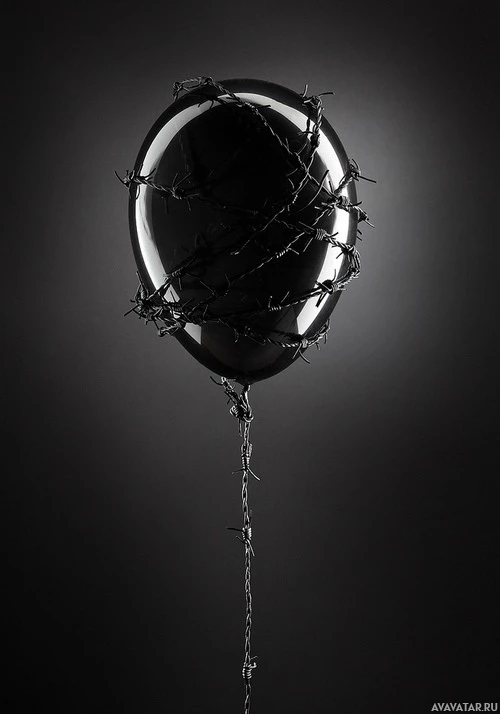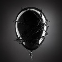a stark contrast between the typically joyful symbolism of balloons and the dangerous, sharp nature of the barbed wire. The background is a neutral gradient that doesn't distract from the main subject.