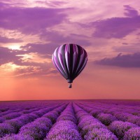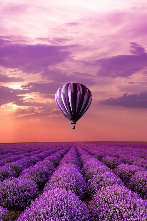 purple color. Above the fields, a hot air balloon is ascending, adding