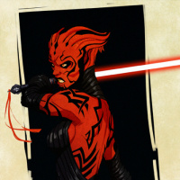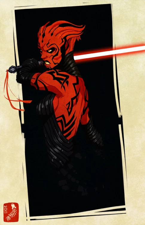 The image depicts an illustration of a character who appears to be a fusion between two popular culture icons: the character Darth Maul from the "Star Wars" franchise and the game character called Genji from