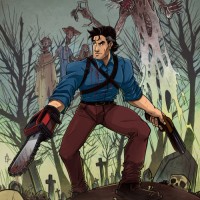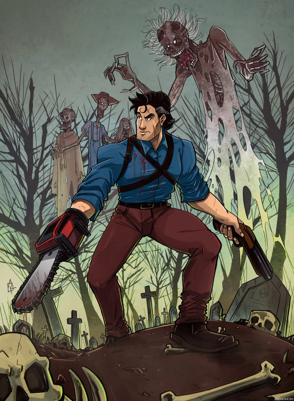 fantasy setting often associated with movies like "Evil Dead." The character is depicted with a determined expression, ready for action against the supernatural elements present in the picture.